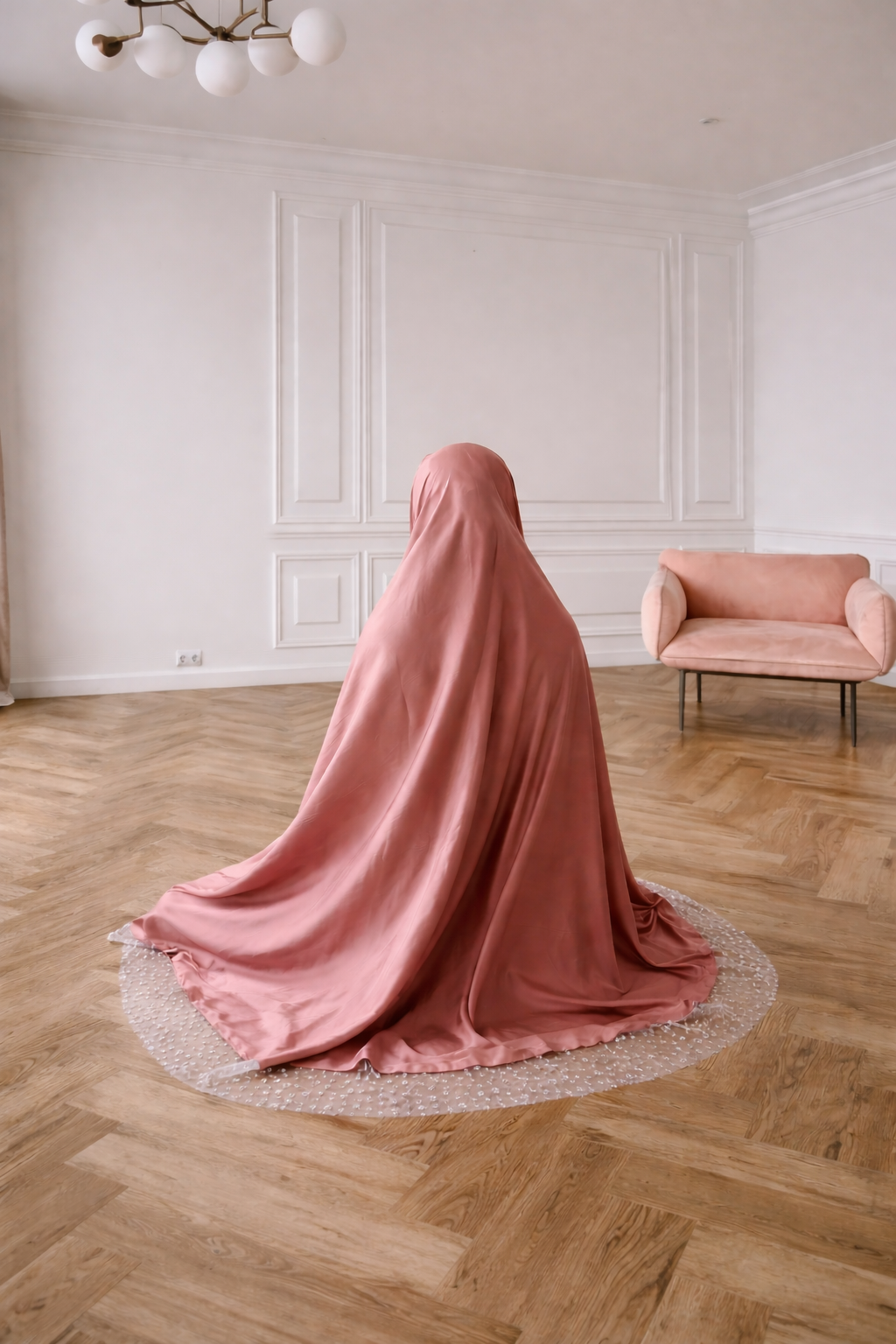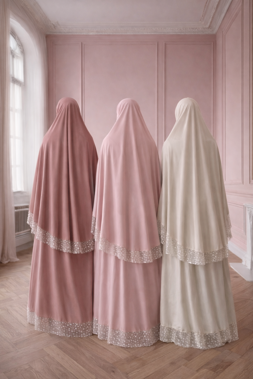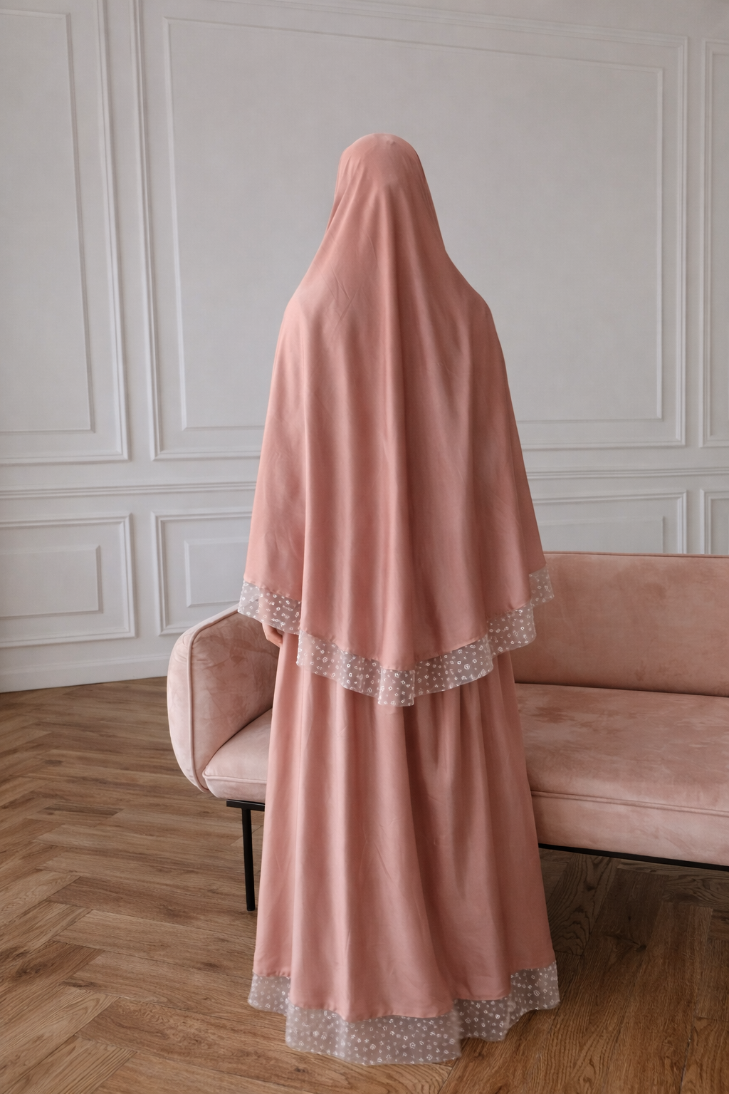 Notre tenue de prière est confectionnée dans un satin doux et lumineux, pensé pour offrir une sensation élégante, légère et confortable au quotidien.